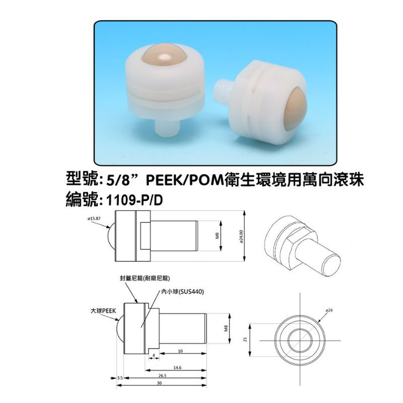 5/8”PEEK/POM衛生環境用萬向滾珠, OD14/OD14P衛生環境用萬向滾珠