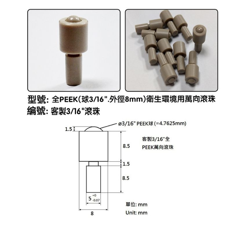 客製全PEEK(球:1/4",外徑:11mm)嵌入式萬向滾珠