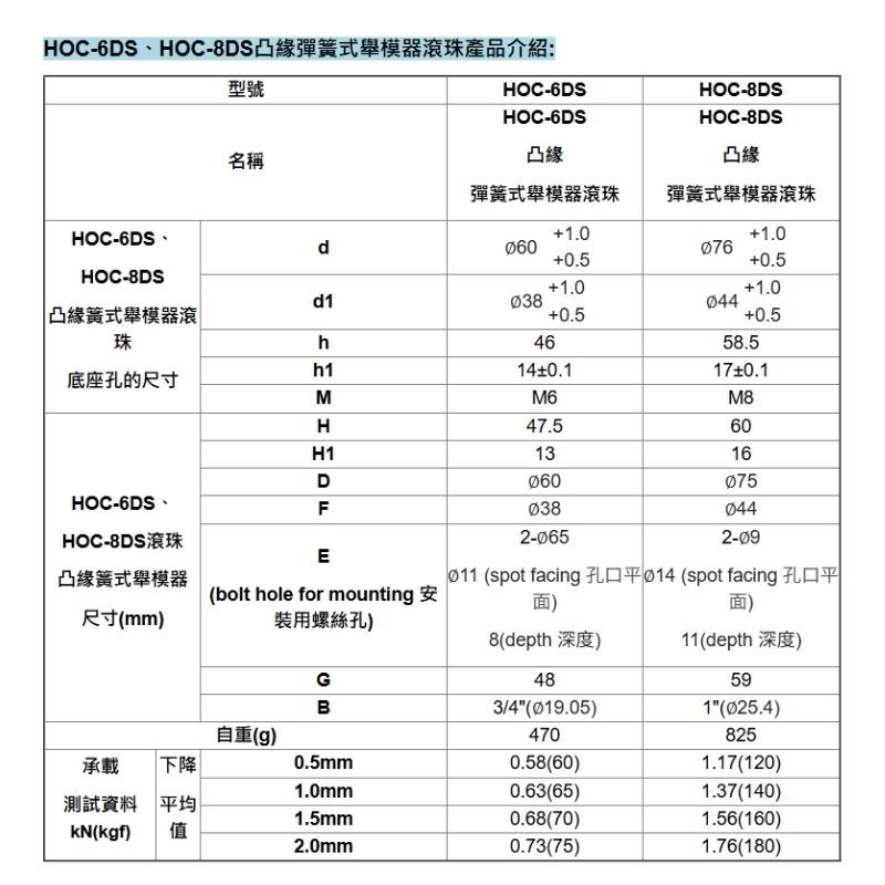 HOC-6DS、 HOC-8DS滾珠 凸緣簧式舉模器 尺寸(mm) |