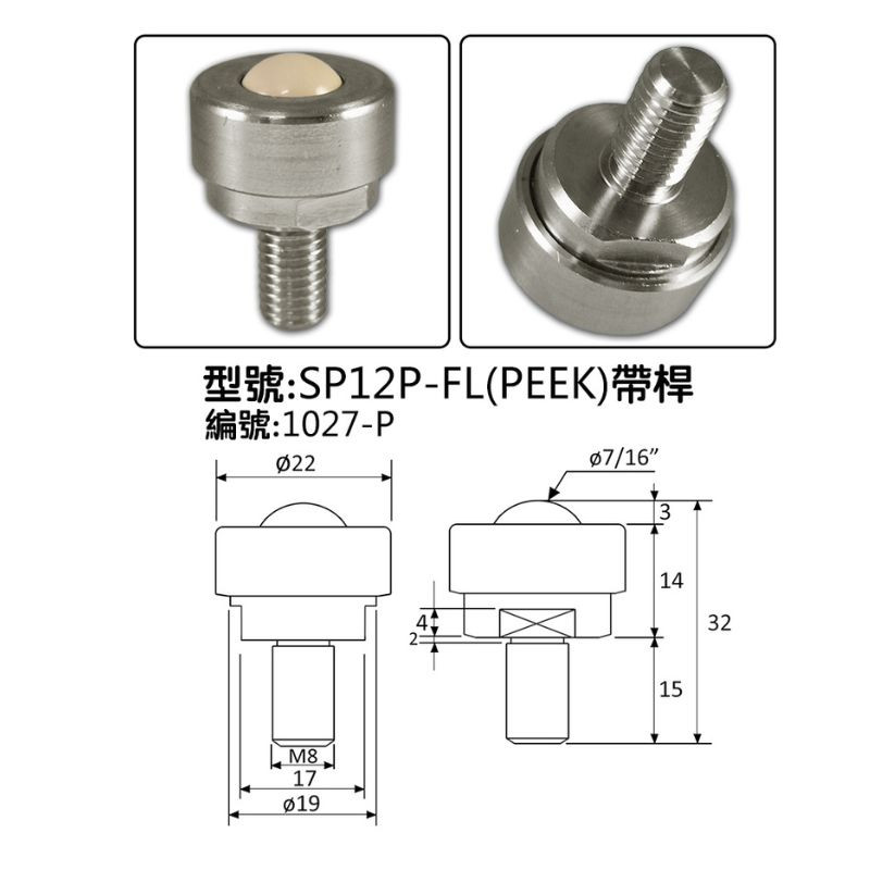大材質為PEEK工程塑膠;小球為SUS440不鏽鋼;本體為SUS304不鏽鋼。 帶桿式萬向滾珠,朝上滾動型 食品、無塵室物流用,輕荷重。