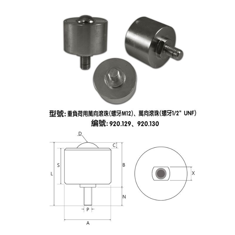 920.129、920.130萬向滾珠(螺牙M12、1/2" UNF)
