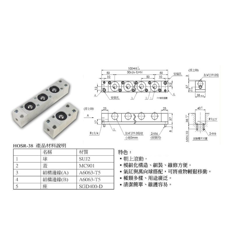 HOSR38-100-A~HOSR38-1000-A氣壓浮動式萬向滾珠