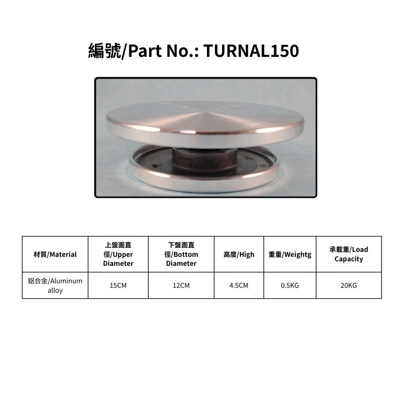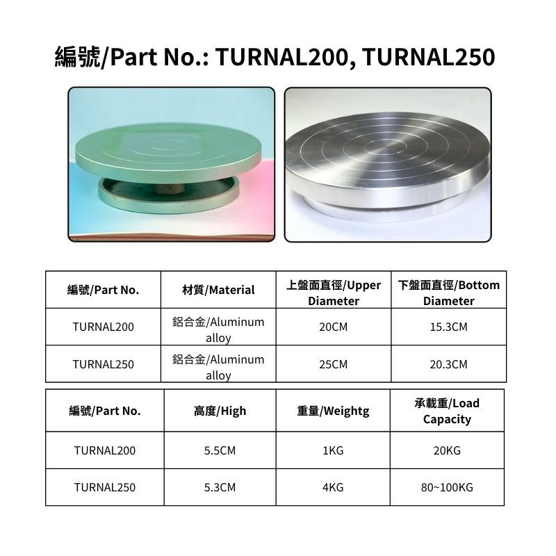 編號: AL250 / TURNAL150-250為鋁合金材質 編號: TURNALS300為鋁合金盤面,底座鑄鐵材質。
