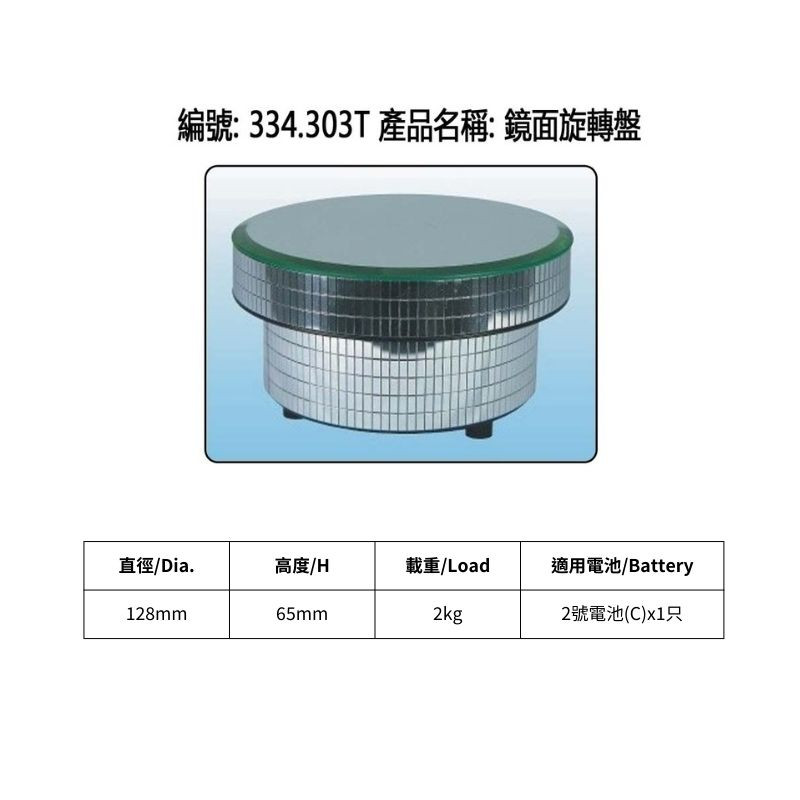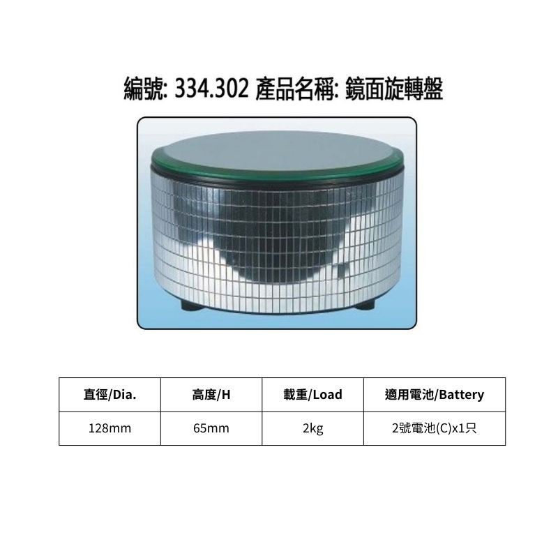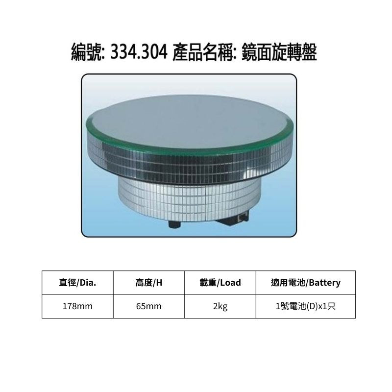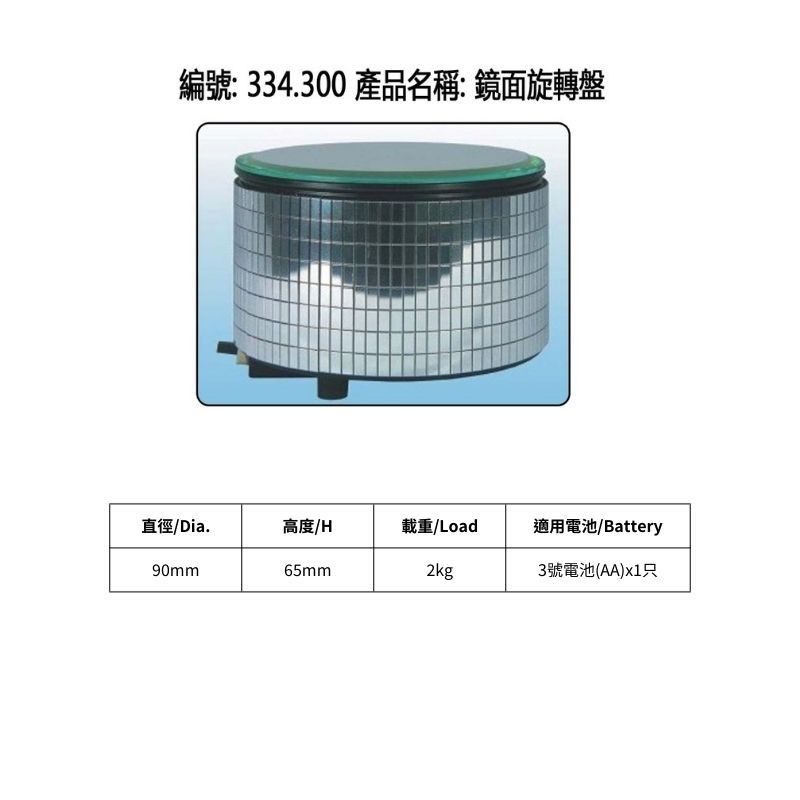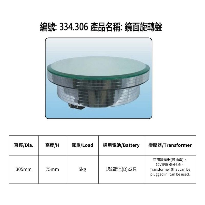 編號: 334.300~330.306 載重: 2~5KG(依實際轉盤編號為準)。 334.300~334.304只能裝電池使用。 334.306可裝電池/變壓器(插電)使用。 • 本系列產品建議連續轉動使用時間為2~3小時休息10~20分鐘;不建議連續轉動使用4~6小時以上。