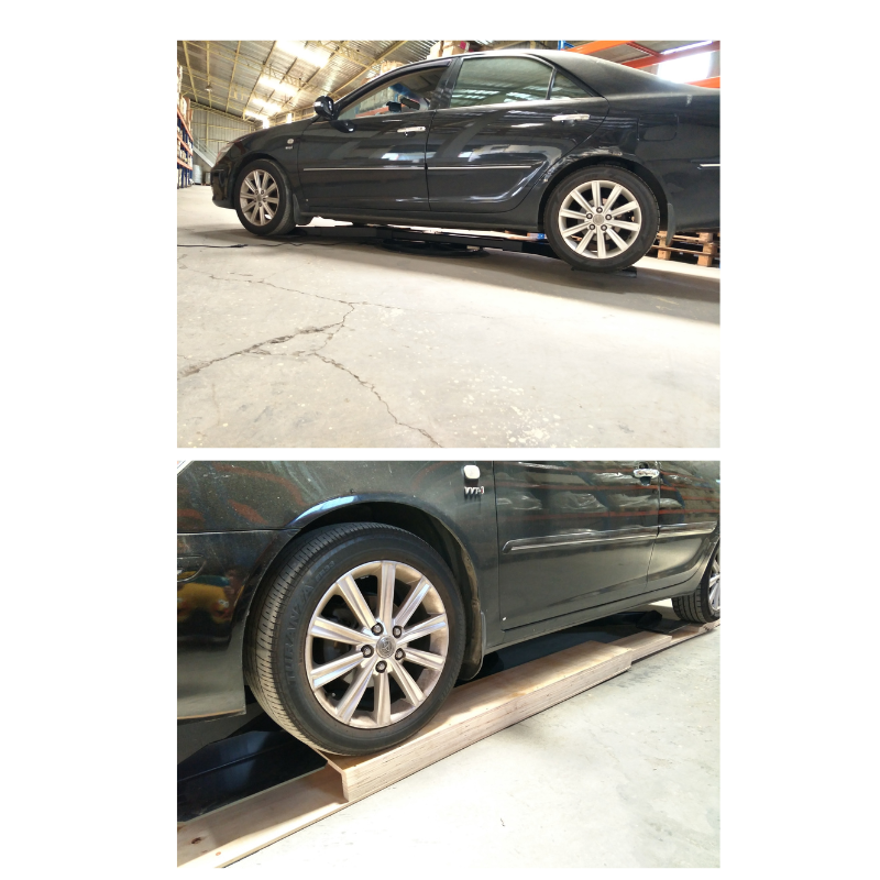 1. 為了確保汽車能集中直接一致的安裝到元件上,頭要探出車外能看到一邊的前輪,慢慢的開上第一對輪墊時先停止。同時要注意,慢慢的沿著坡道開上,直到前輪都在第二對輪墊同時後方的輪子正對另一對輪墊。
