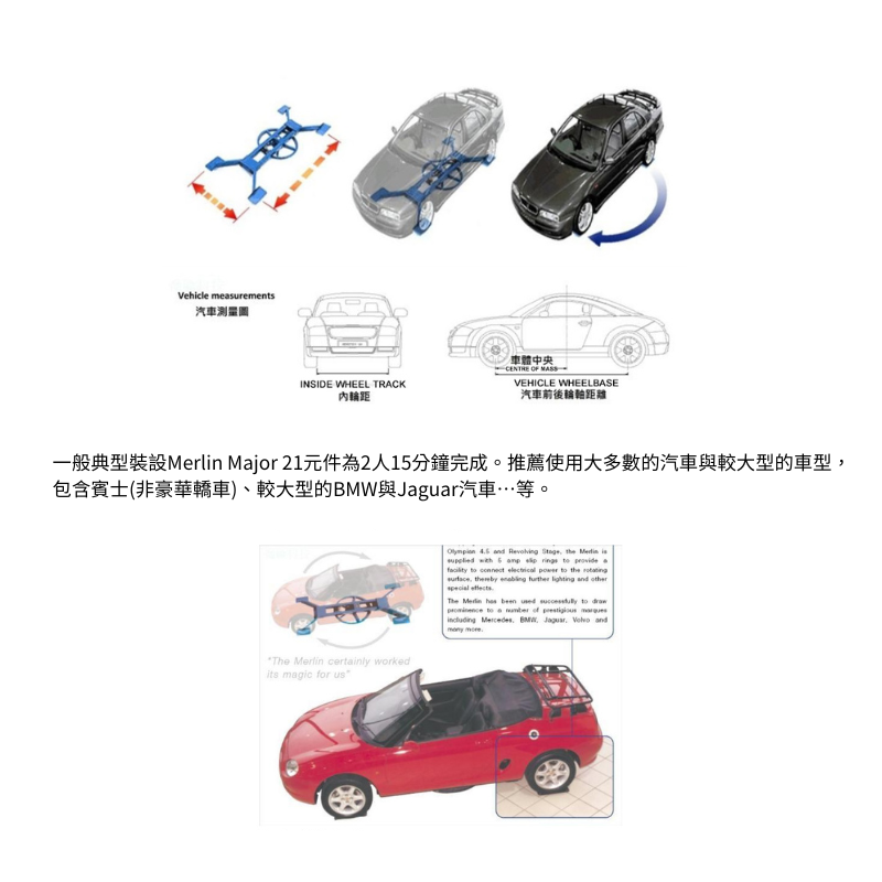 專為現今主流之重達2,500Kg/5,500lbs車款設計, 廣泛地被使用在有名的車款上,像Mercedes 、BMW, Jaguar 及其他有名之車種。