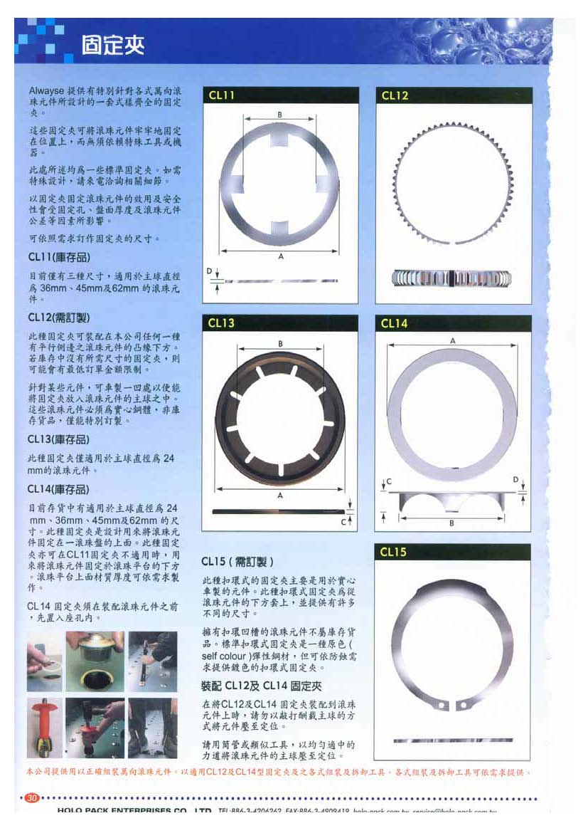 提供特別針對各式萬向滾珠元件所設計的一套式樣齊全的固定夾。 這些固定夾可將滾珠元件牢牢固定在位置上,無須依賴特殊工具或機器。 以固定夾固定滾珠元件的效用及安全性會受固定孔、盤面厚度及滾珠元件公差等因素所影響。