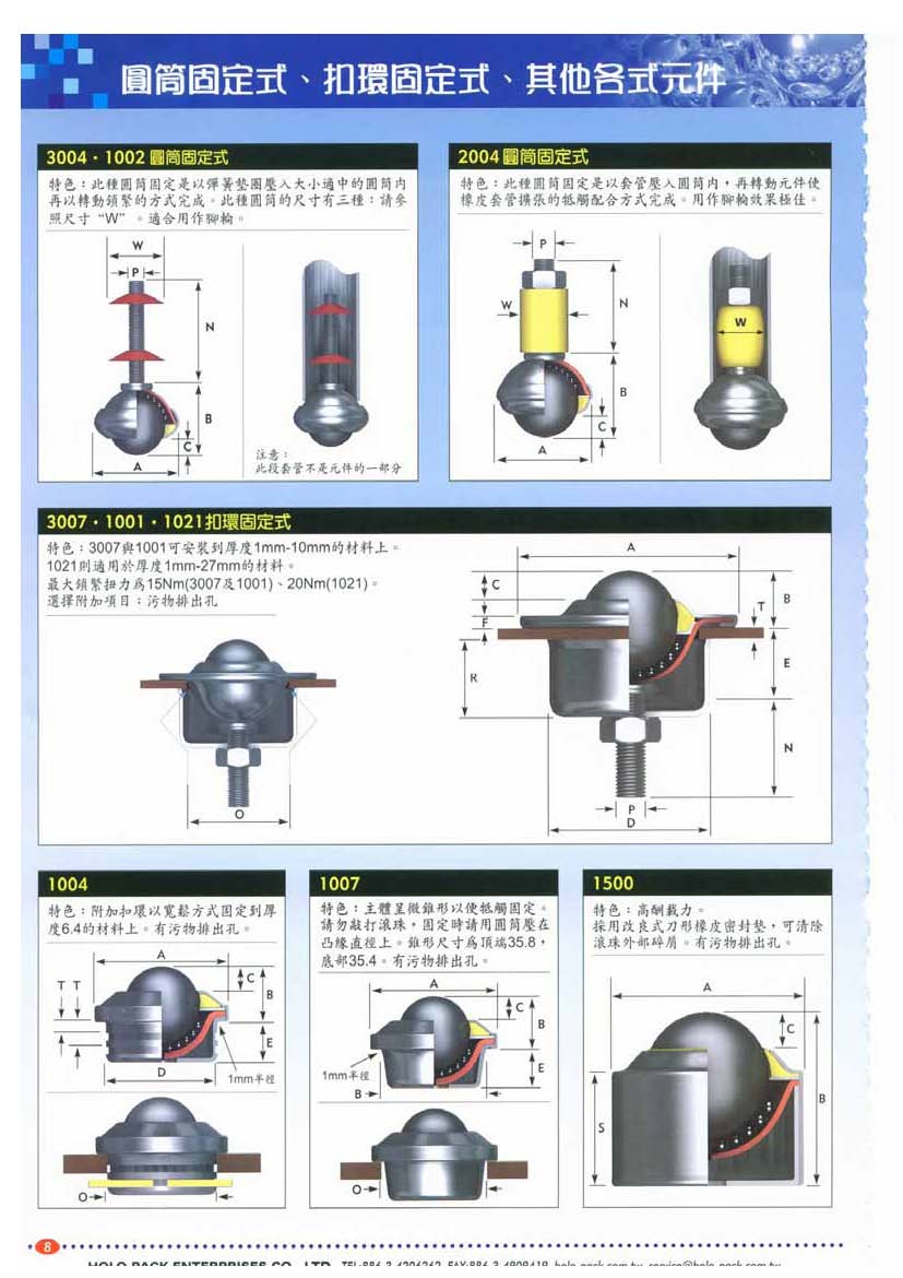 圓筒固定式滾珠元件: 特色: 此種圓筒固定是以彈簧墊圈壓入大小適中的圓筒內,再以轉動鎖緊的方式完成。 扣環固定式滾珠元件: 3007、1001可安裝到厚度1mm-10mm的材料上。 1021則適用於厚度1mm-27mm的材料。 最大鎖緊扭力為15Nm(3007及1001)、20Nm(1021)。 選擇附加項目: 污物排出孔