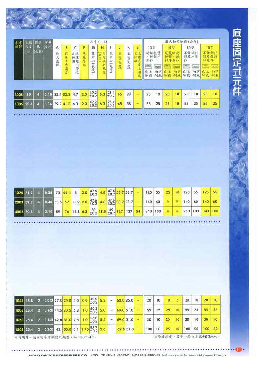 其他固定滾珠元件: 皆有污物排出孔。 底座固定滾珠元件: 特色為加重型固定。