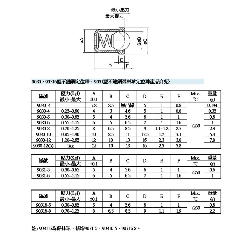9030型全不鏽鋼定位珠 壓入式定位珠 材質: 全不鏽鋼 註: 9031-6球為得林、90316-5與90316-8為全SUS316材質