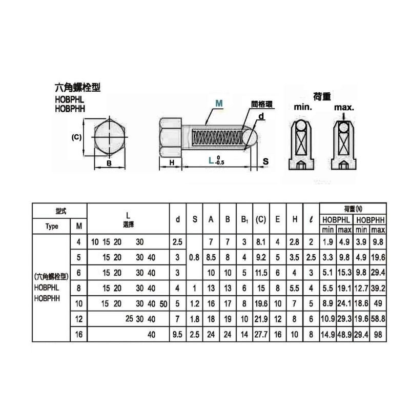 HOBPHL, HOBPHH六角螺栓型定位珠 彈簧 |
