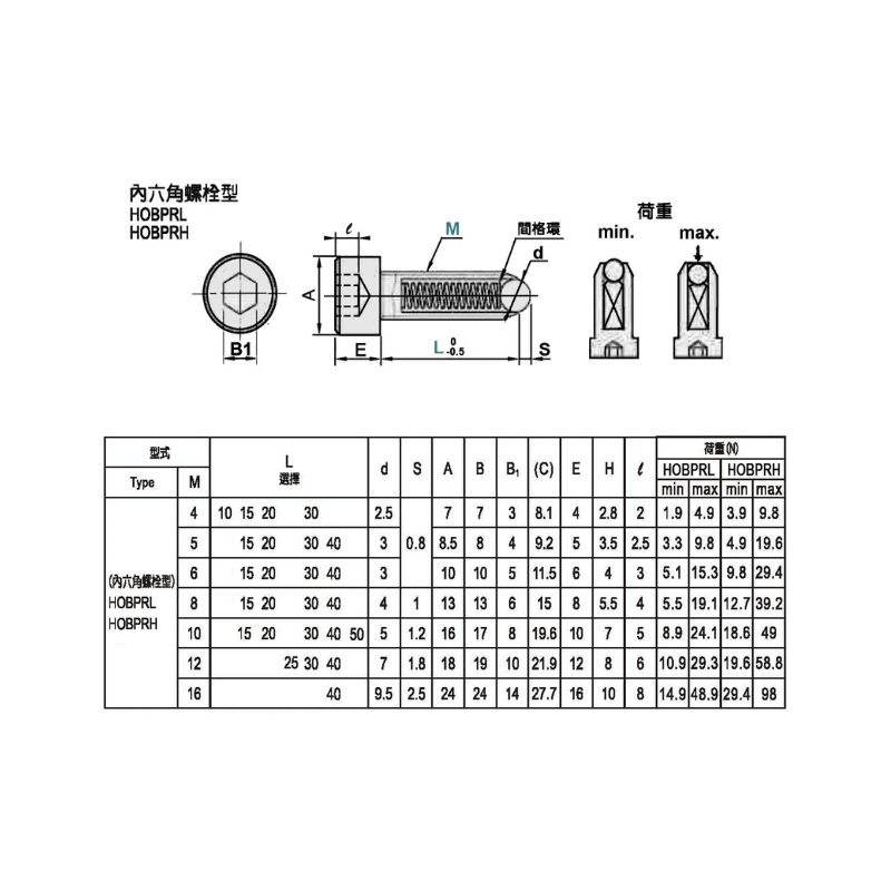 HOBPRL, HOBPRH內六角螺栓型定位珠 彈簧 |